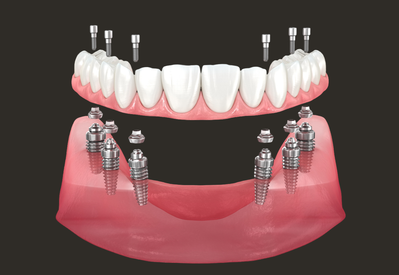 Fixed full-arch solutions with guided surgery, titanium implants, and immediate provisional bridges when clinically suitable.